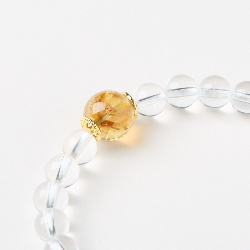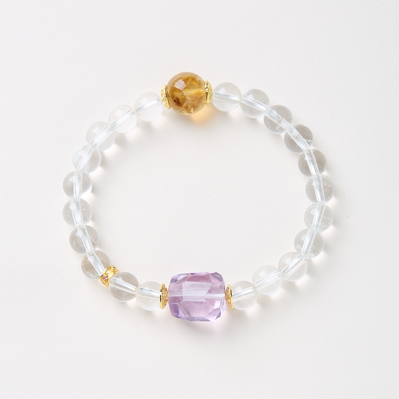 This bracelet features 7mm high-quality white crystal beads paired with amethyst and yellow citrine accents. The barrel-shaped charm design signifies smooth transitions and flowing energy. White crystal is believed to amplify purity and focus, while amethyst symbolizes wisdom and spiritual growth. Their combination fosters inner peace and the seamless flow of external opportunities. The minimalist and elegant design makes this bracelet ideal for daily wear or as a meaningful gift.
